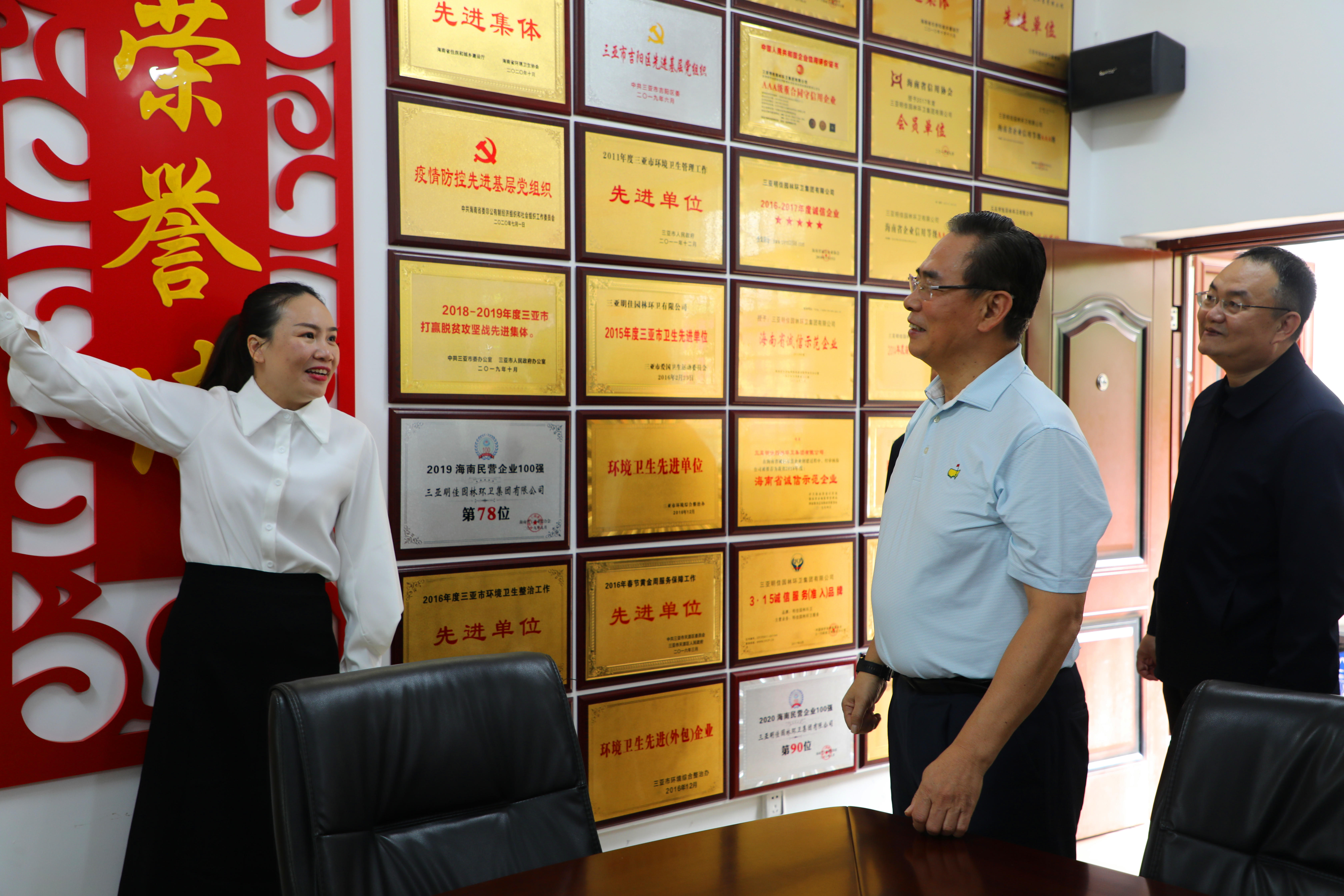 董事長(zhǎng)陳明、總裁陳云及工會(huì)主席高斐斐在集團(tuán)門前迎接蔡副主席的到來(lái)。